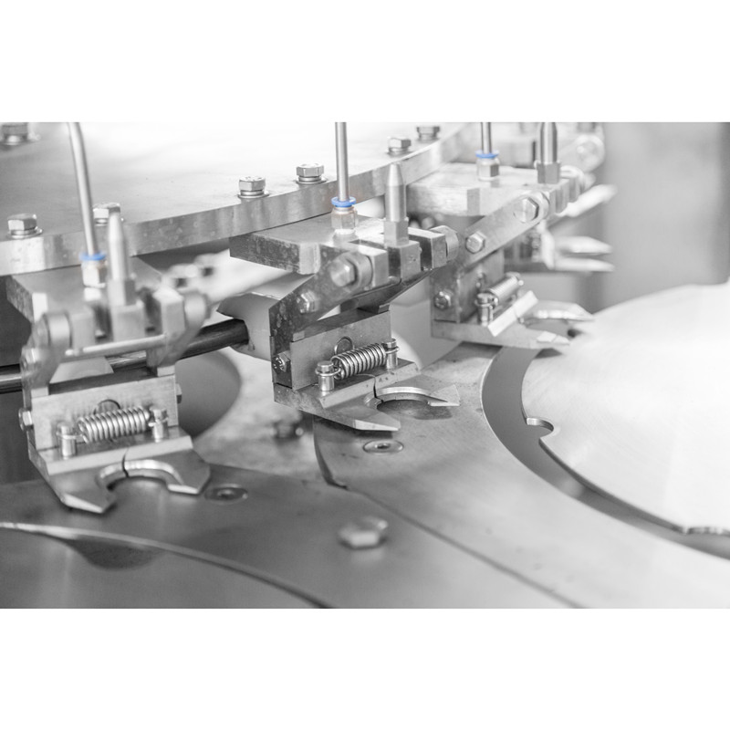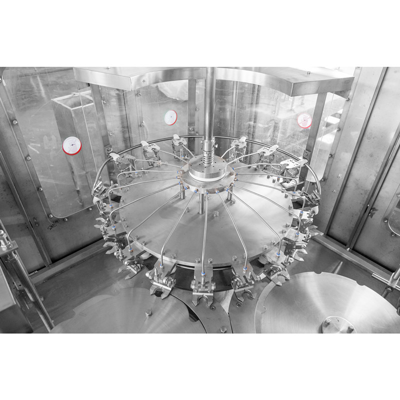 XGF14-12-5三合一灌裝機主要用于礦泉水、純凈水的灌裝作業(yè)。本機將沖洗、灌裝、旋蓋三功能合在一個機體上,全過程實現(xiàn)自動化。適用于聚酯瓶、塑料瓶,各部分的適用瓶型調(diào)整采用手柄轉(zhuǎn)動實現(xiàn),輕松自如,簡便快捷。灌裝方式采用了新型的常壓灌裝,使灌裝速度更快更穩(wěn)定,所以與同規(guī)格的機器相比本機的產(chǎn) 量更高,效益更大。本機采用了先進的可編程控制器(PLC)控制機器的自動運行,進瓶鏈道采用變頻器調(diào)整,與主機變頻器相互配合使進瓶運行更穩(wěn)定可靠,光電檢測各部件的運行狀況。自動化程度高,操作簡便。是礦泉水、純凈水生產(chǎn)廠家理想的首先設(shè)備。